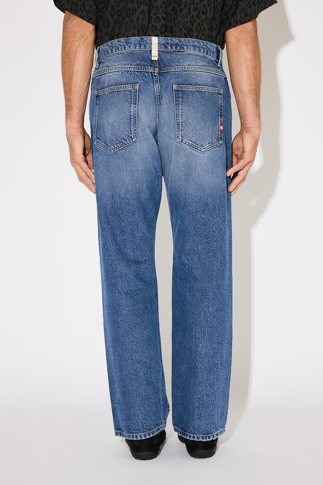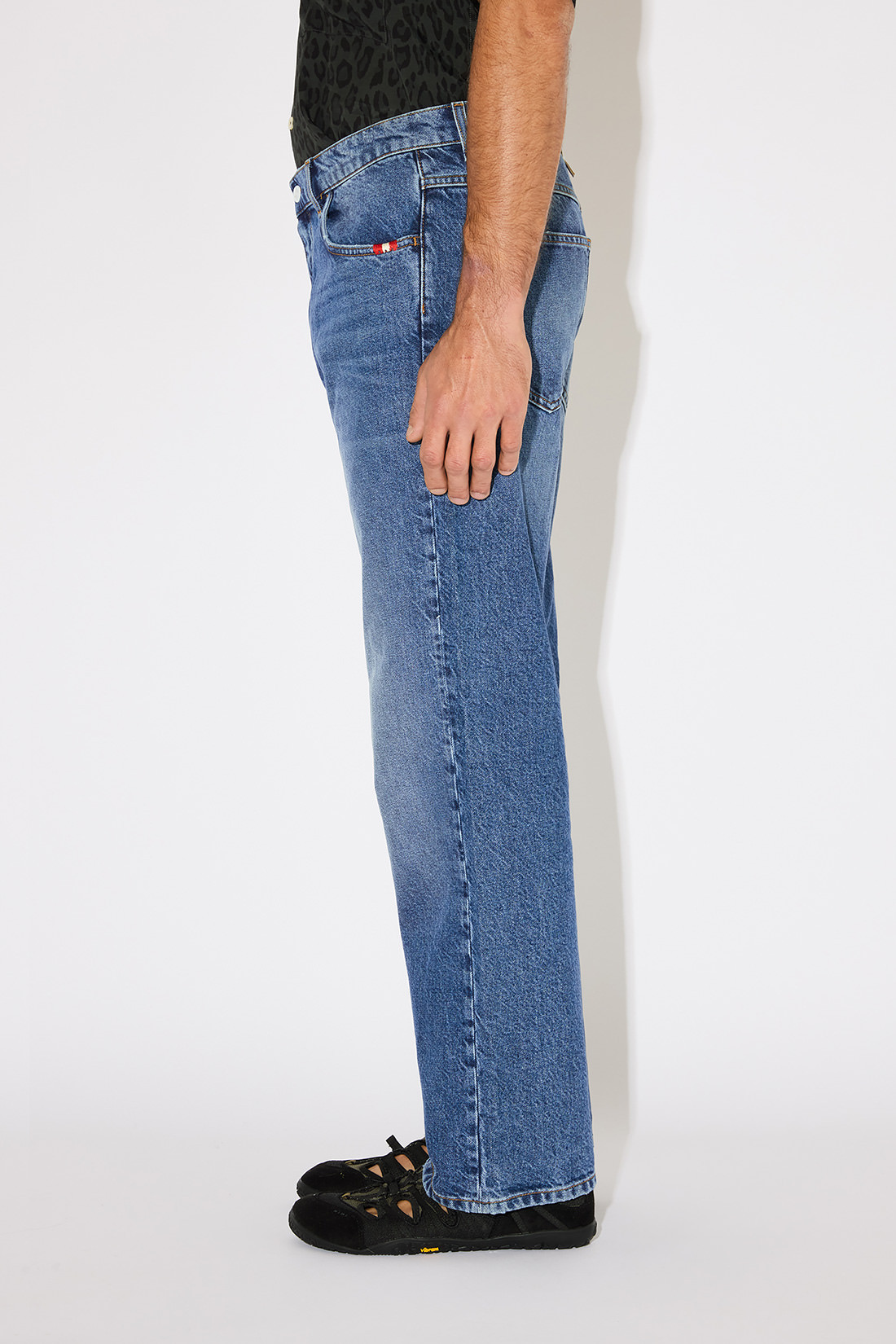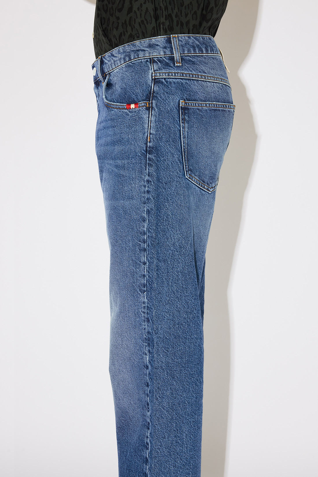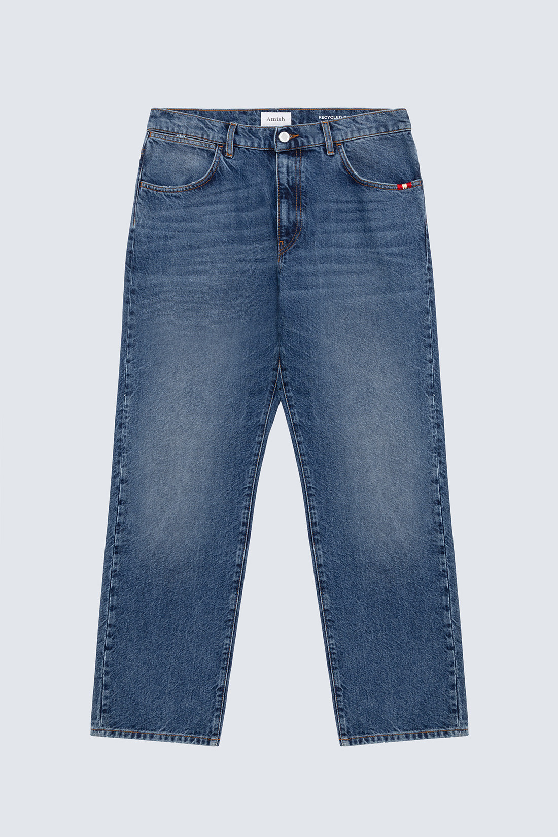 - Medium wash standard recycled denim with contrast stitching.