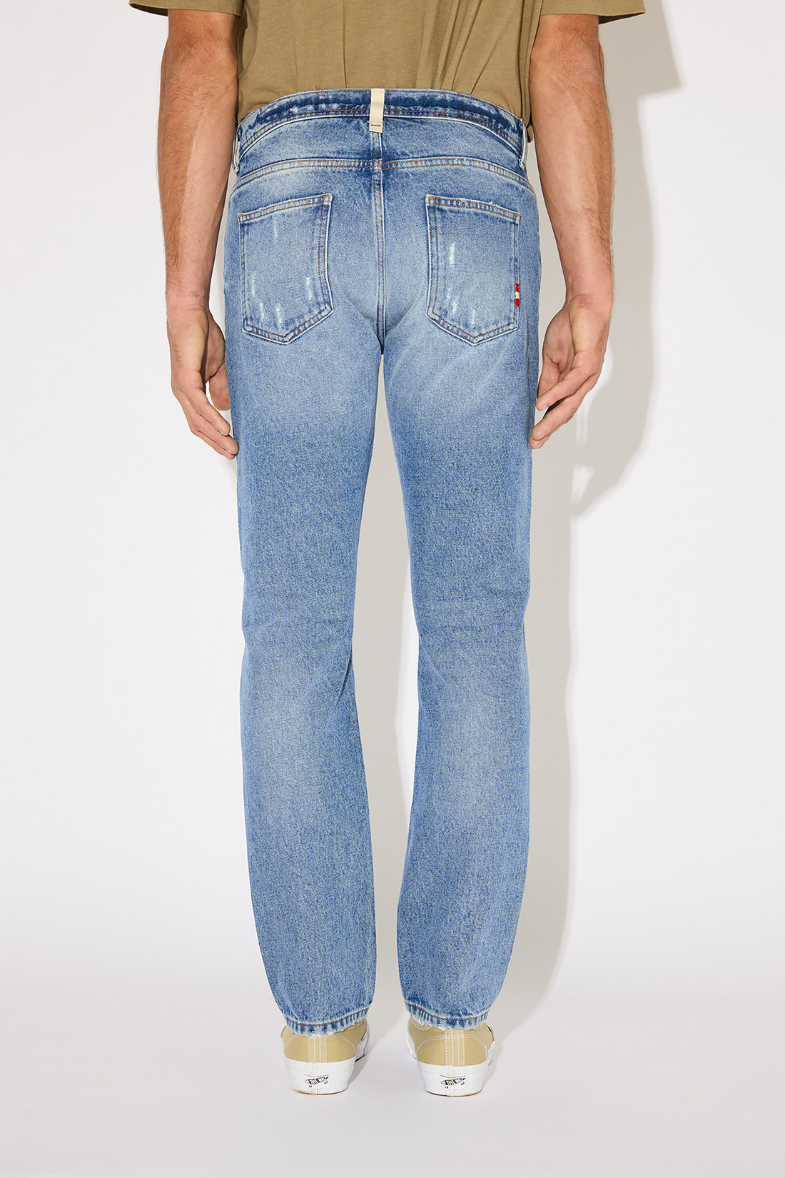 - Medium waistband with loops and peculiar logoed fabric loop at back.
