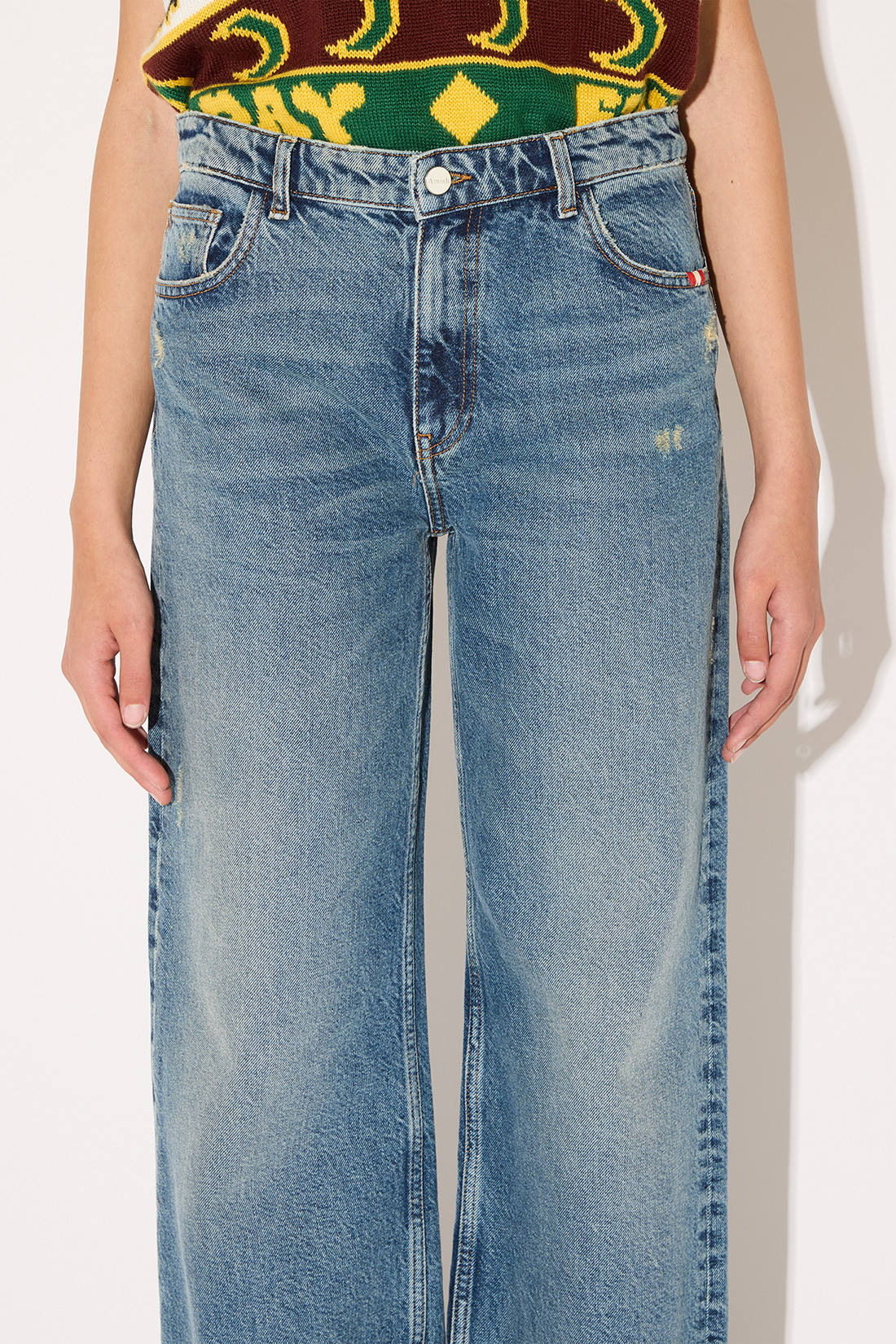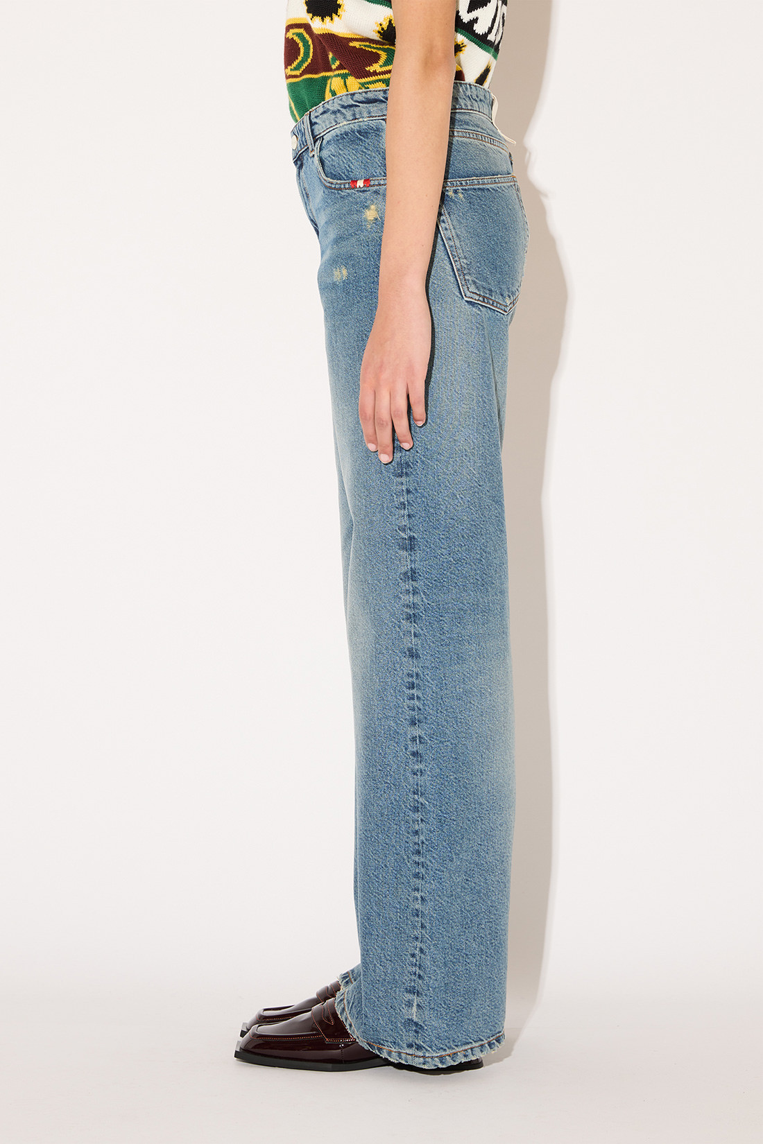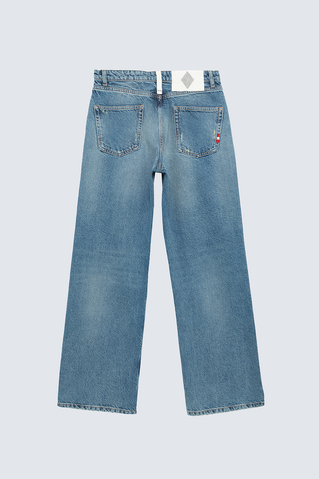 - Medium wash Recycled dust denim with used-effect rips at front.