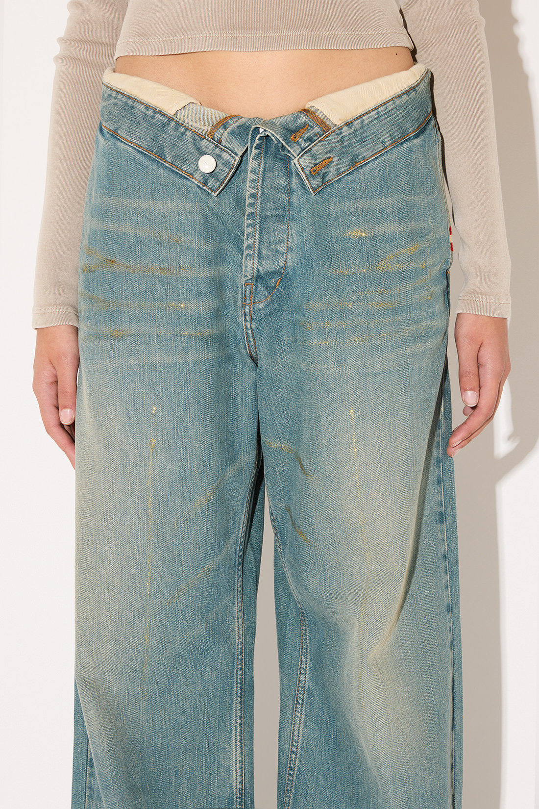 - Gold Finger-Wash Roll-Up Denim with brushstroke details on the front.