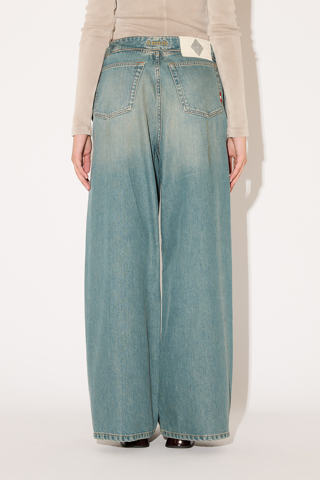 - Mid-rise with inside-out waistband, belt loops, rear label, and Amish embroidery on the back.