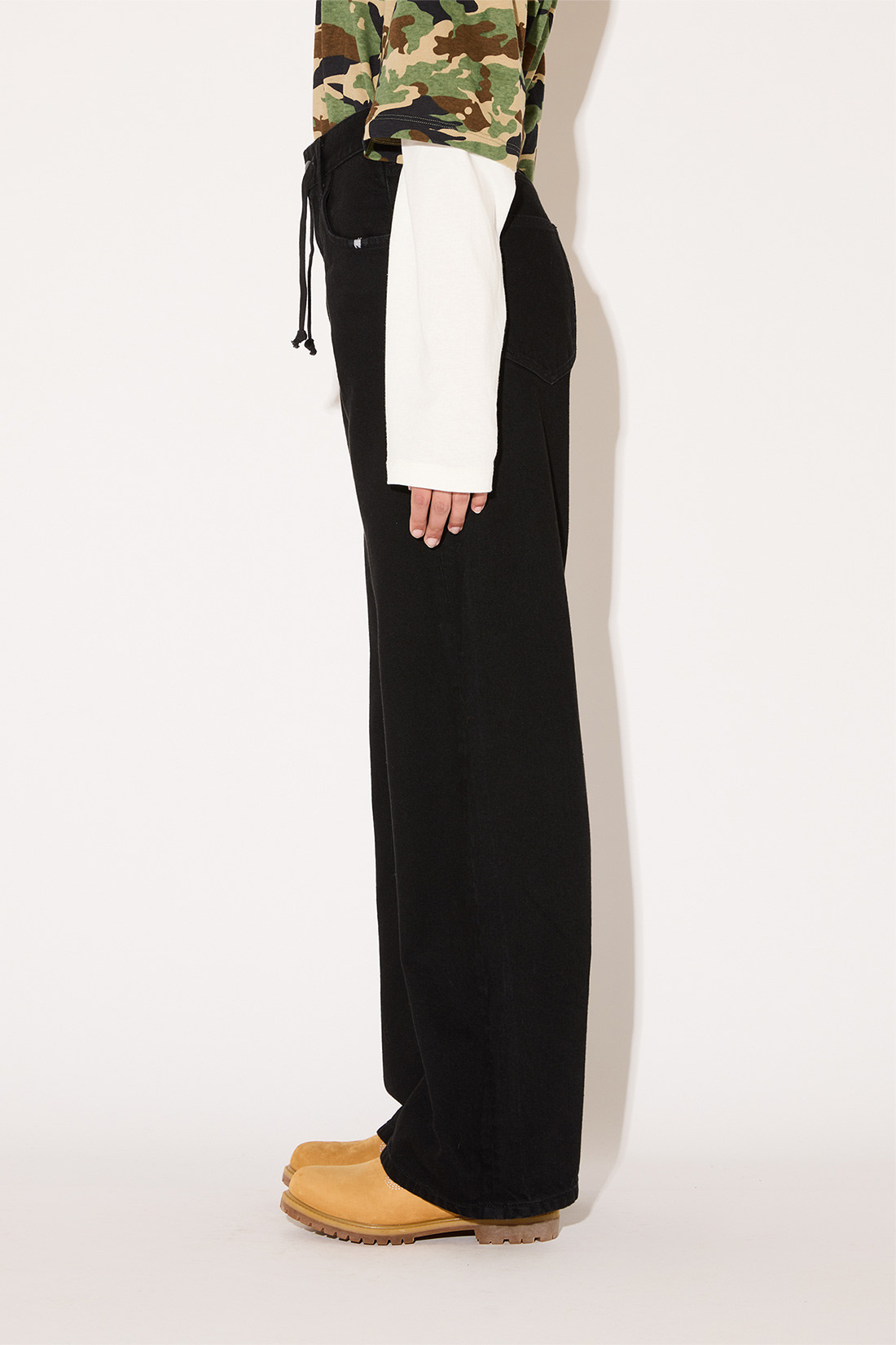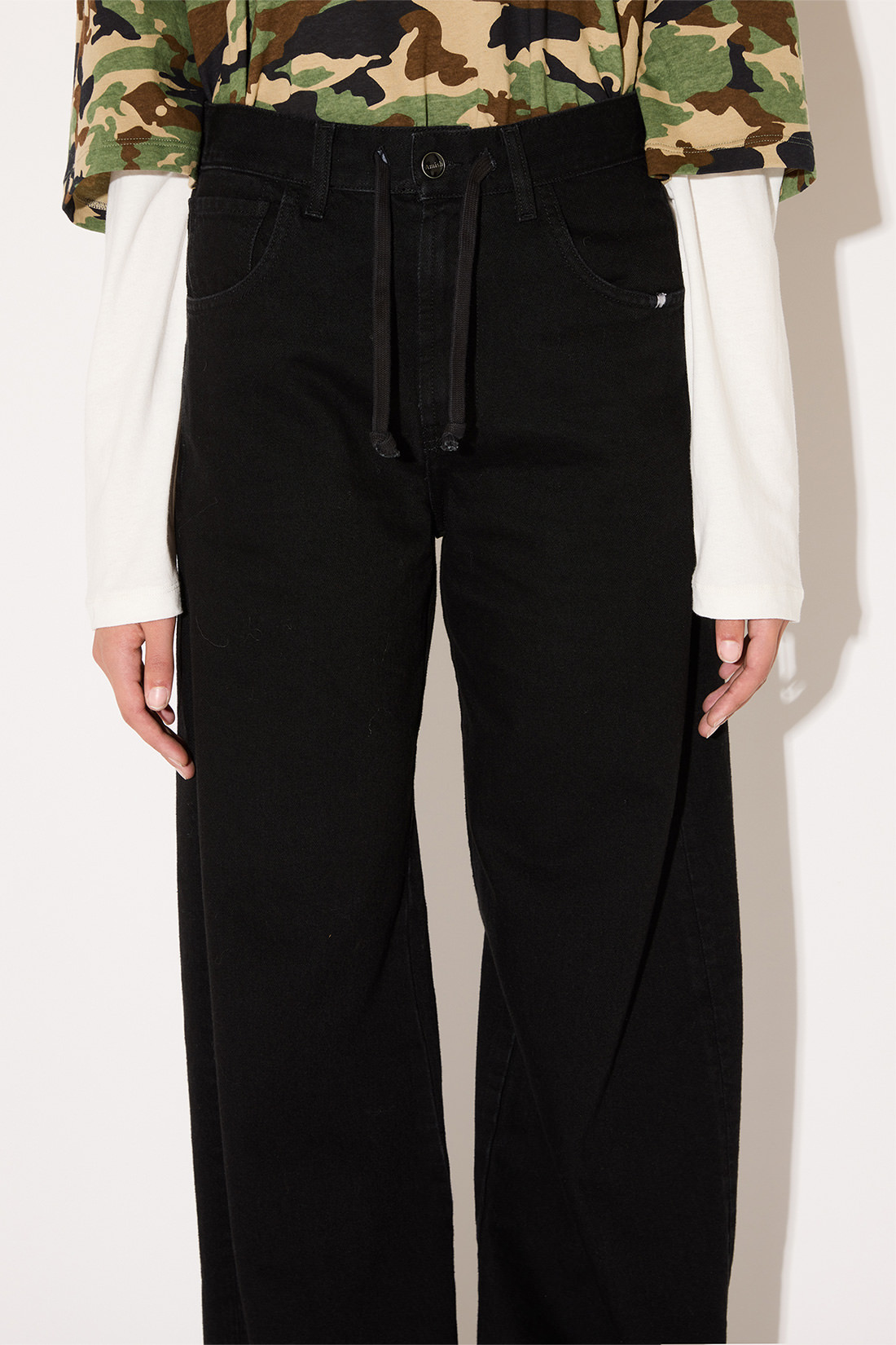 - Vita media con passanti, salpa coulisse e iconico passante in tessuto logato sul retro.